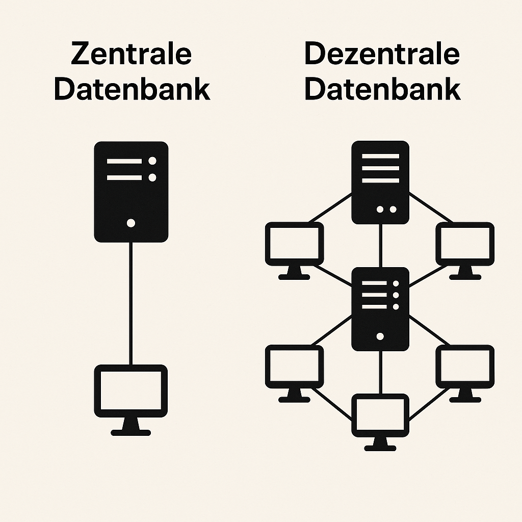 Das ist ein typisches Beispiel für eine zentrale Datenbank: Alle Daten liegen an einem einzigen Ort, der die volle Kontrolle hat. Das ist einfach, aber auch riskant – denn wenn dieser eine Ort versagt, sind die Daten in Gefahr.
